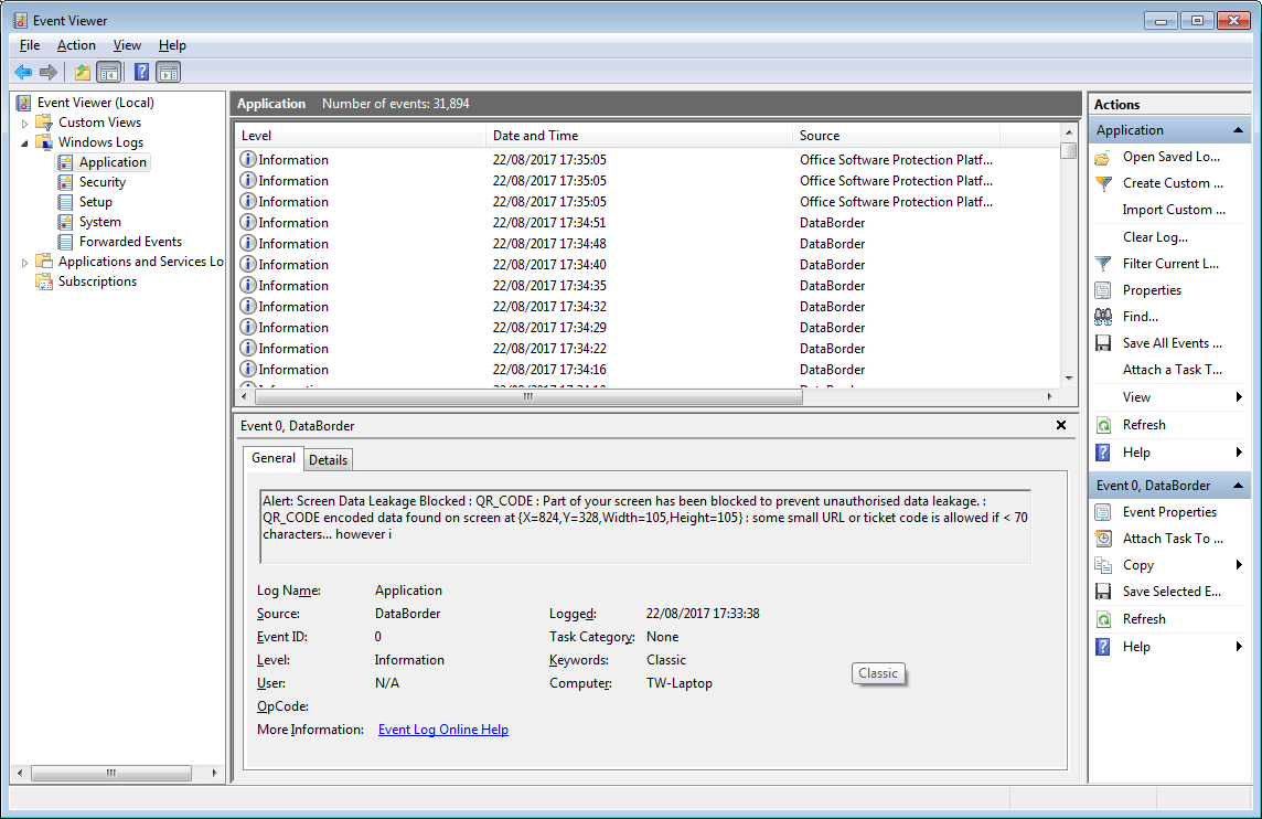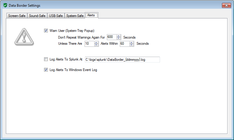 As with the screen protection, the details of the security alert are written to the windows event log and/or written to a splunk format log file for SEIM integration.