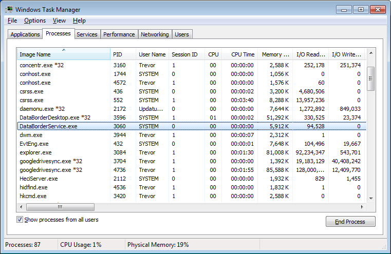 The Service starts a DataBorderDesktop process in the session of anyone who logs onto the machine. This process is the only process the user can see – ie they cannot see DataBorderDesktop processes running in other sessions or the service process. Should the desktop process be stopped, the service will automatically restart it.